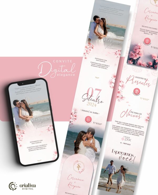 Romântico e com a opção de incluir fotos do casal, o Convite de Casamento Virtual Elegance Estendido é a escolha perfeita para celebrar esse momento especial com elegância e estilo!