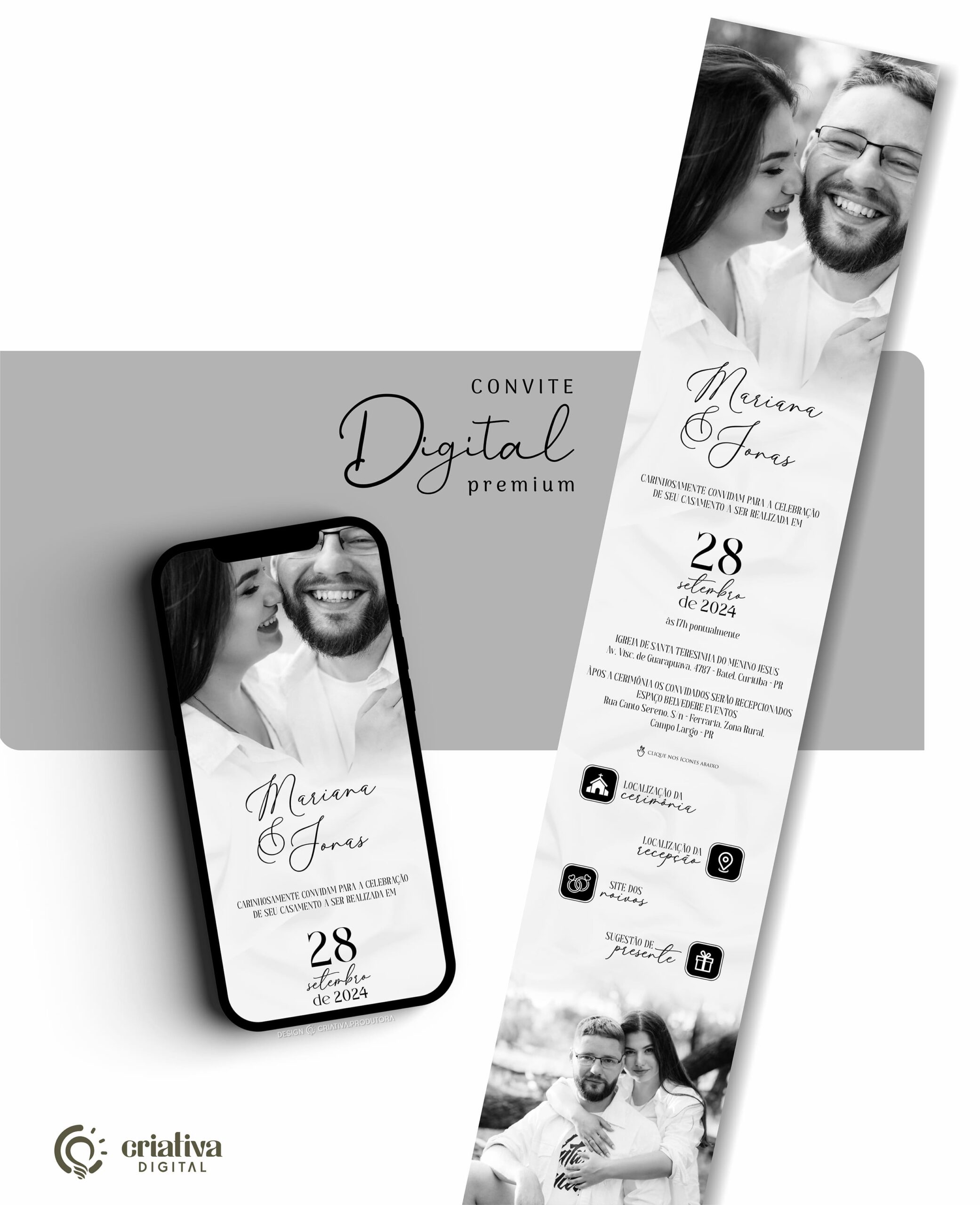 Se você procura um convite de casamento moderno, romântico e com a opção de incluir 1 foto do casal, o Convite de Casamento Virtual Premium é a escolha perfeita para celebrar esse momento especial com estilo!