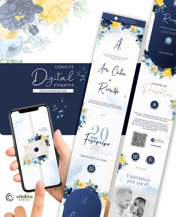 ♫ Convite de Casamento Virtual Floral Azul e Amarelo | Elegance Musical cod.292