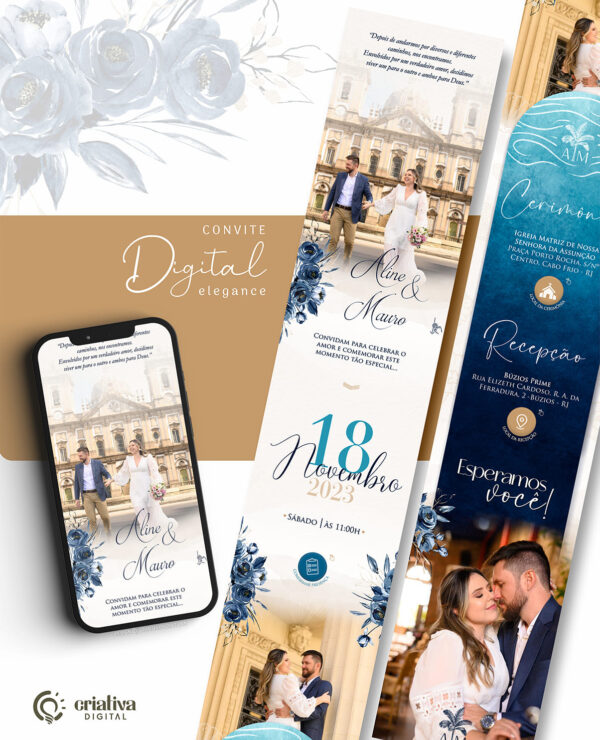 Convite de Casamento Virtual Floral Azul Marinho, dourado, creme, serenity | Elegance cod.295