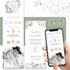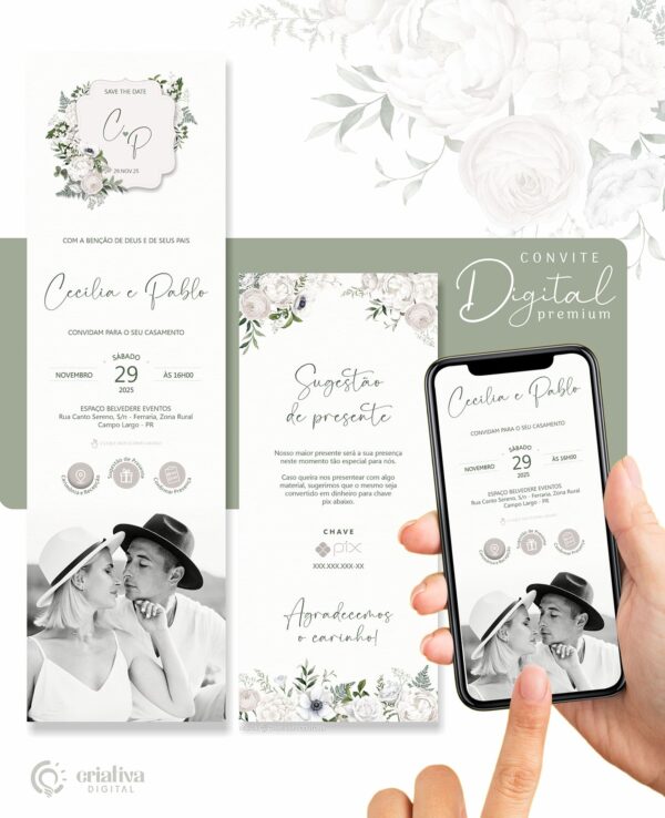 Convite de Casamento Virtual Floral branco e verde, cinza | Premium cod.311