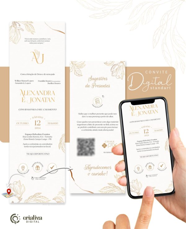 Convite de Casamento Virtual Floral Dourado, Off White, Champanhe, Pérola | Standart cod.254
