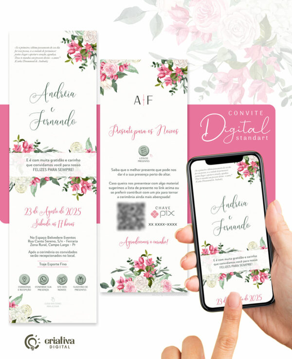 Convite de Casamento Virtual Floral Rosa Bounganville, Fucsia, Branco, Verde| Standart cod.312