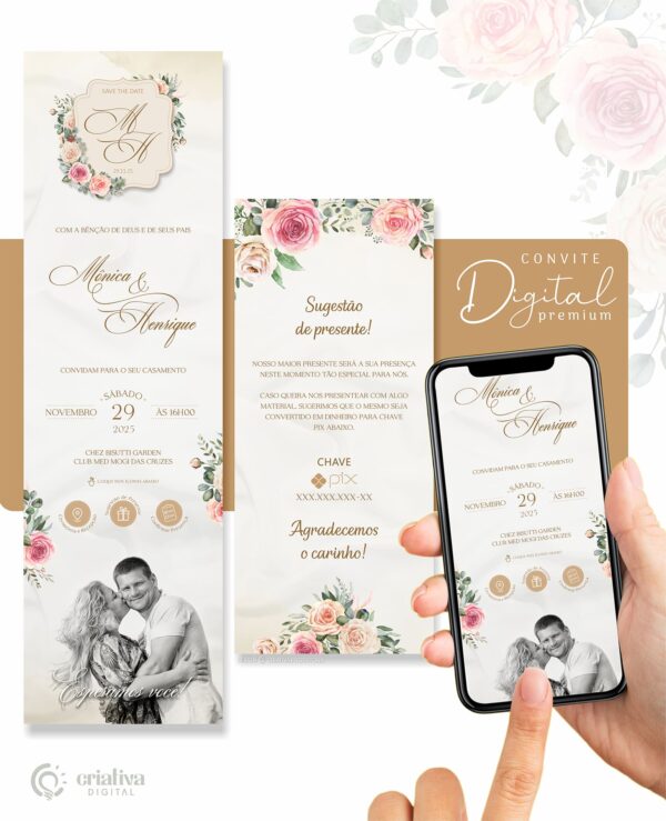 Se você procura um convite de casamento moderno, romântico e com a opção de incluir 1 foto do casal, o Convite de Casamento Virtual Premium é a escolha perfeita para celebrar esse momento especial com estilo!