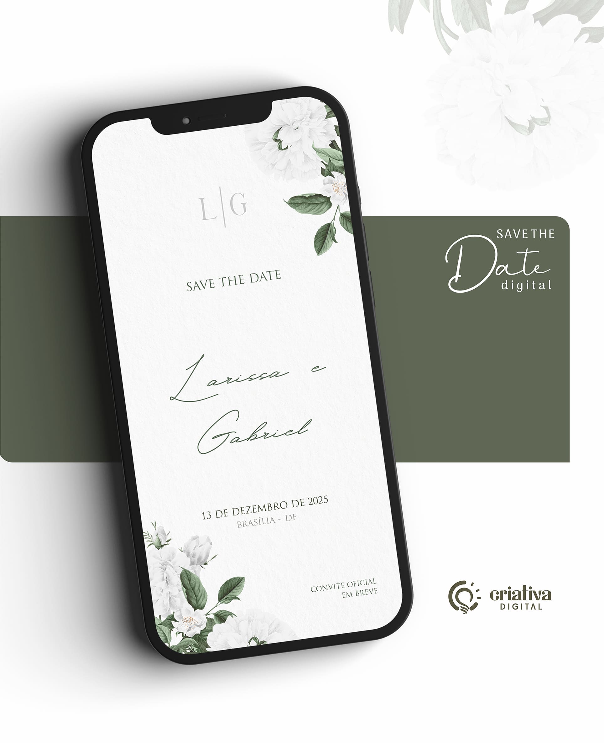 Save The Date Digital de Casamento | Clean Floral Branco, Verde e Cinza cod.308