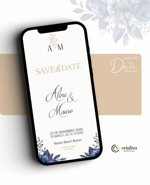 Save The Date Digital de Casamento | Floral Azul Marinho, Dourado cod.256